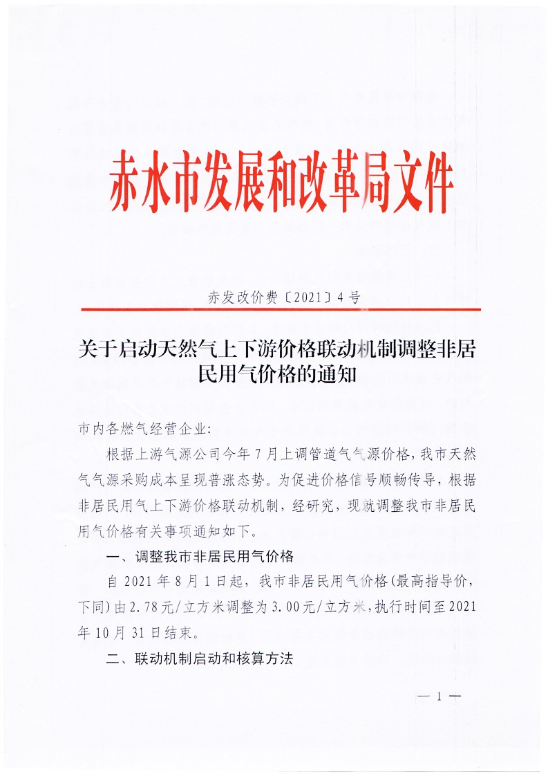 赤水市發(fā)展和改革局文件—關(guān)于啟動(dòng)天然氣上下游價(jià)格聯(lián)動(dòng)機(jī)制調(diào)整非居民用氣價(jià)格的通知